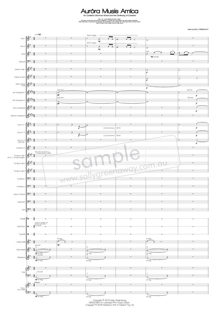 Not a traditional fanfare, the piece evokes images of Canberra, Australia located between Sydney to the North and Melbourne to the South. The opening bowed metallic percussion give a sense of that first ray of light coming from the horizon over Lake Burley Griffin and the towering National Carillon. With an ascending fifth, from G to D, the French Horn summons the sun to rise further, stirring the Australian wildlife. In its entirety, the opening is a vivid crescendo leading to a remarkably clear and rich blue sky as Solo Trumpet gives the first statement of the fanfare, with a dance-like harmonic underpinning from the woodwinds.