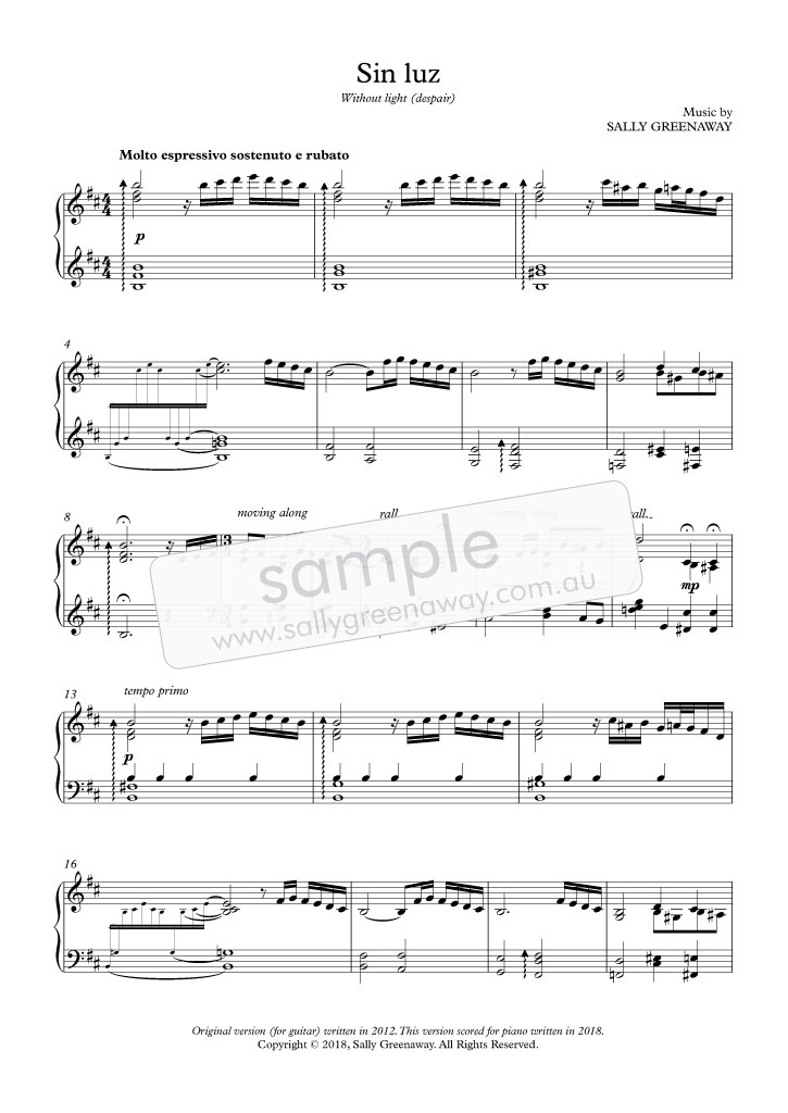 Sin Luz - without light. Sublime and introspective with a lamenting, heartfelt melody and a broody harmonic palette. Commissioned as part of a set of contrasting works for guitar by John Couch. The piece emerged during a time when the composer was feeling completely lost - her husband was seriously ill in hospital and doctors told her that he may potentially die. The seriousness of potentially losing him and the devastation one feels when confronted with that situation is at the heart of this piece.