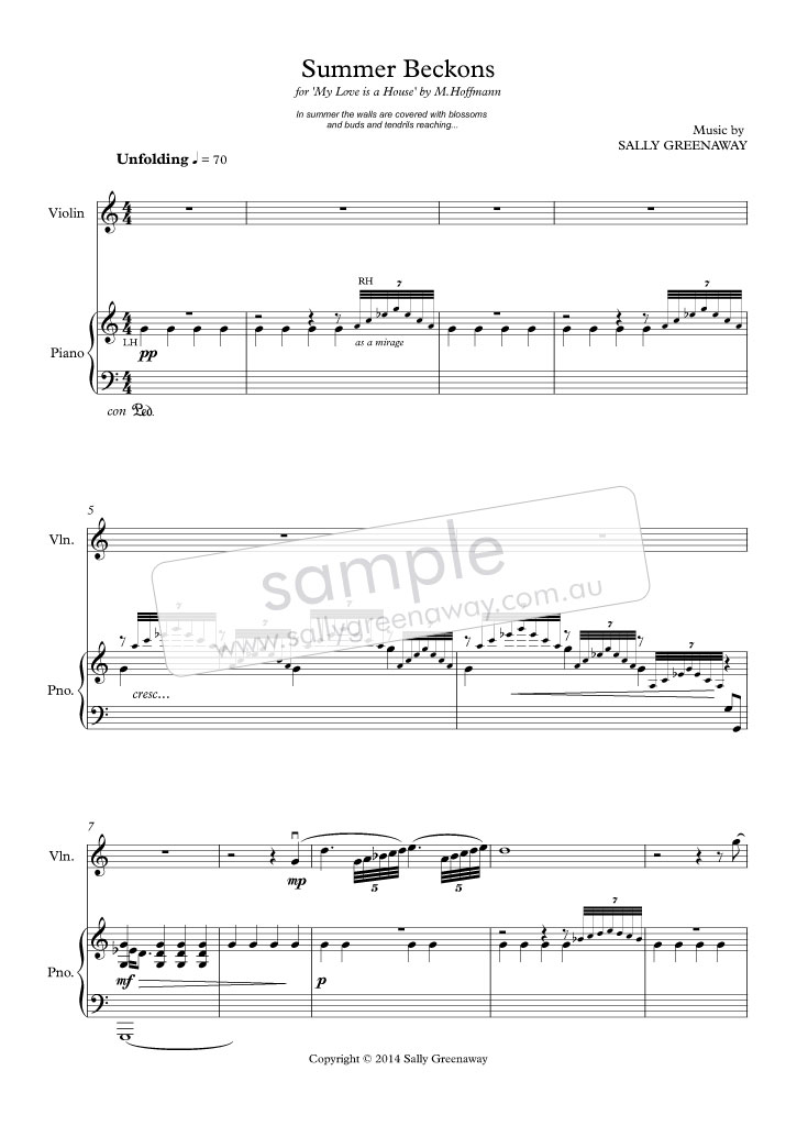 The introduction and middle sections evoke the shimmering of water fountains. The music expands with a vivid and joyful wonder as the vine tendrils twirl, seeking their next grip hold as they face their leaves towards the warmth of the sun: the beauty and bounty of Summer growth!